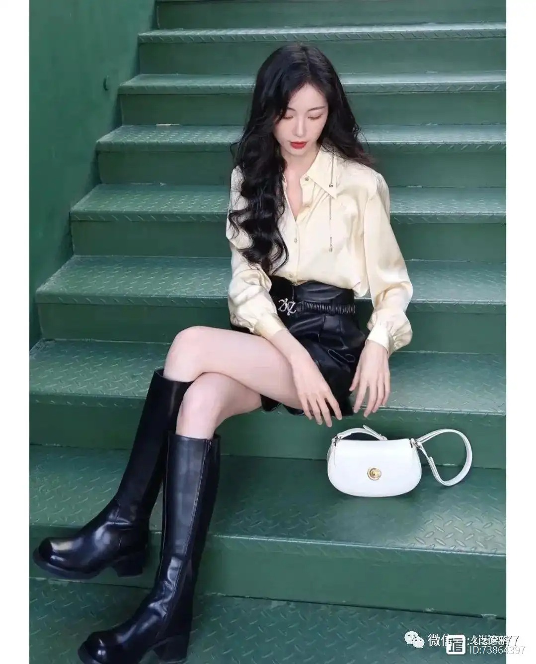 初秋的天气完全可以直接单穿一件衬衣,自带温柔的鹅黄色衬衣搭配上丝巾作为点缀,下半身搭配黑色皮短裙和黑色长靴,气场加倍,简约耐看,大方典雅!