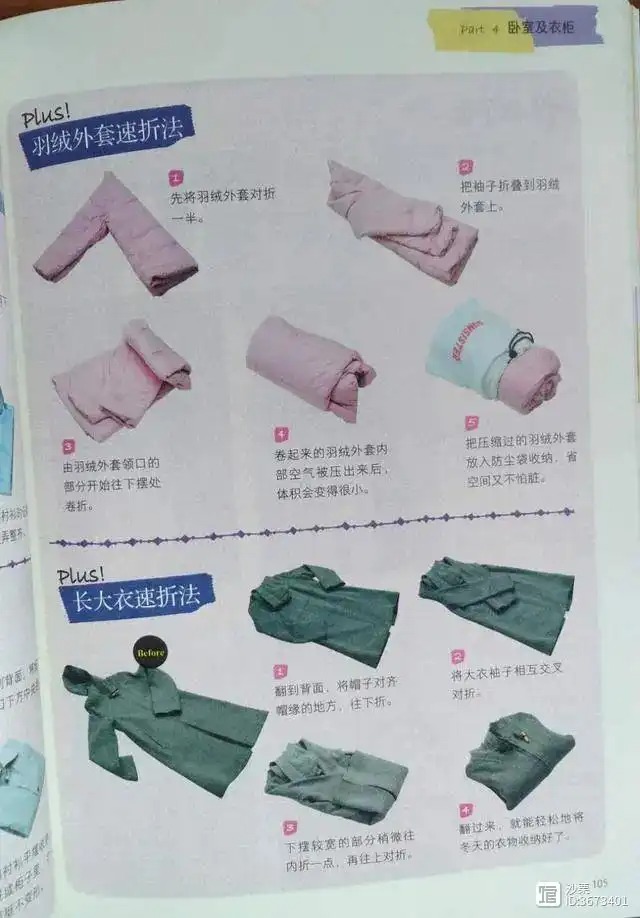 书中不仅图示了衬衫、T恤、羽绒服、长裤等大件衣物的折叠,存放方法,还有袜子、领带之类的小衣物的收纳方法也是特别实用。