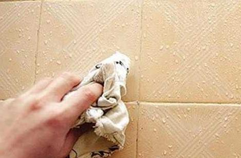 喷洒一定量的清洁剂在瓷砖上,再贴上厨房纸巾,约10分钟后将纸巾撕掉,再用湿布努力擦拭即可。