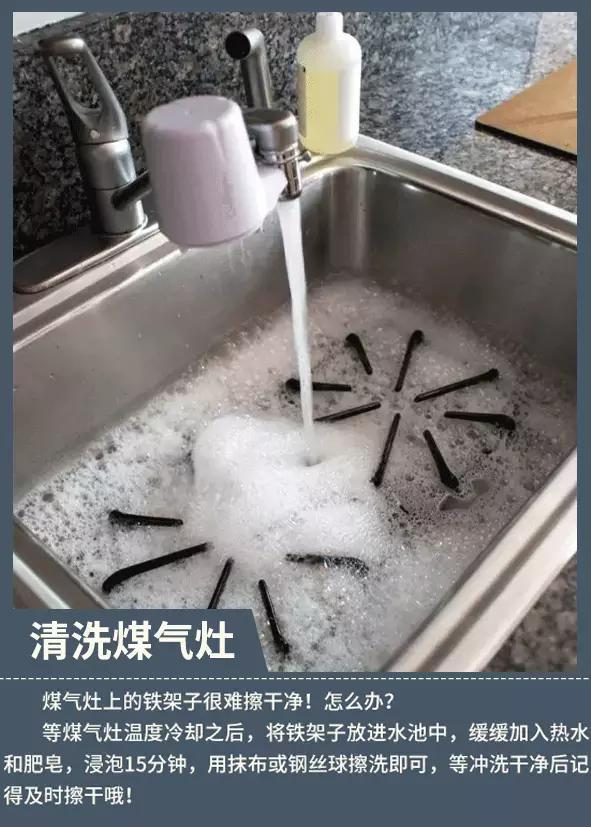 等煤气灶温度冷却之后,将铁架子放进水池中,缓缓加入肥皂水,浸泡15分钟,用抹布或钢丝球擦洗即可,等冲洗干净后记得及时擦干哦!