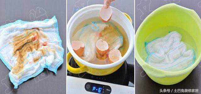 把抹布放在盛有清水的锅里,再放入生蛋壳,大火煮6分钟,然后取出晾干,污渍就会消失,所以平时做饭时蛋壳不要扔了,留着有大用处!