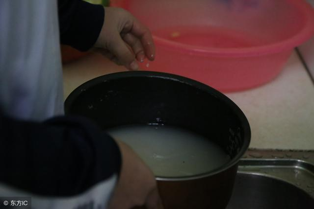 准备淘米水,加入橙子皮,再倒入锅中用火煮热,倒进盆里。