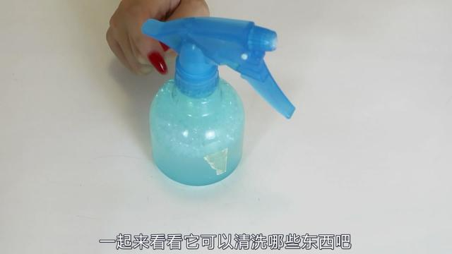 然后我们再拿出一些清水,倒入这个容器中将它们稀释一下,搅拌一下,搅拌均匀后我们就可以把它倒入一个喷壶里面,把喷壶的盖子拧紧,这一个强力去污剂就已经完成了。