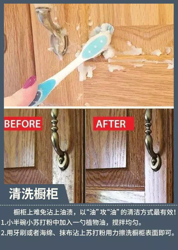 厨房里的木器上积满油垢时,可用漂白粉加水涂刷在油污表面,第二天用清水冲干净即可。