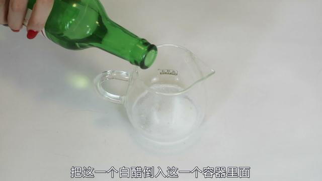 然后拿出我们家中的白醋,把这一个白醋倒入这一个容器里面,白醋里面有醋酸它可以起到杀菌的作用,而且它还有去除污垢的作用,