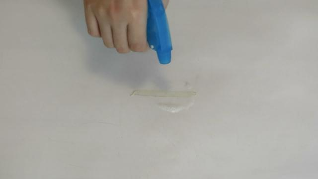 一起来看看它可以清洗哪些东西吧,大家看一下现在这个桌子上粘了一些双面胶,我们是如何怎样都把它给擦不下来的,我们该怎么办呢,我们把我们的自制溶液轻轻的喷洒在上面,