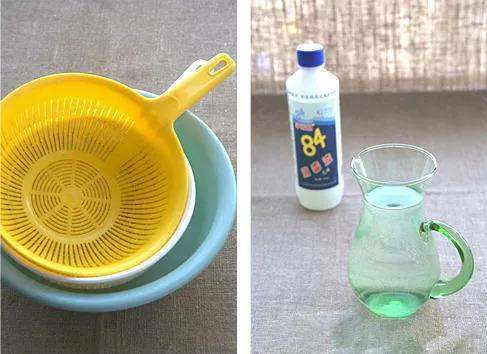 在盆子里倒入84消毒液和清水,以1:200的比例兑在一起,将需要“去污”的塑料制品放入,浸泡两个小时后,再用清水反复冲洗干净就可以了,效果好又不会产生任何腐蚀作用,浸泡过塑料筐的水还可以倒入马桶中,还能起到清洁马桶的作用。