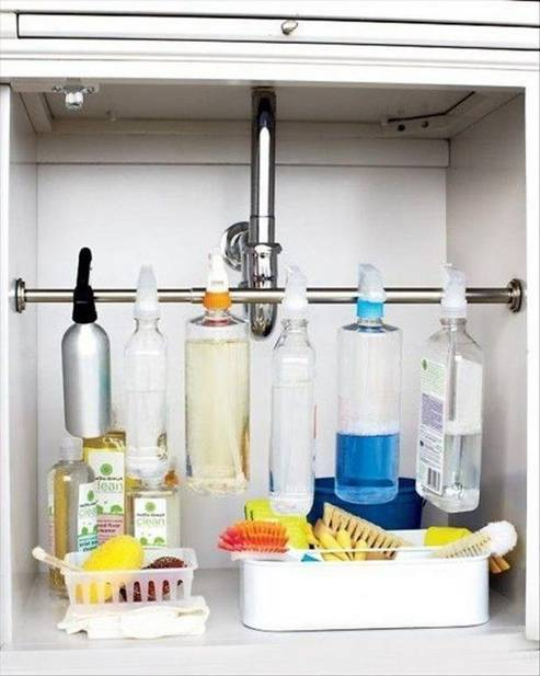 洗碗的水槽或下面的柜子内侧都可以挂上带框的架子,伸手就能拿到