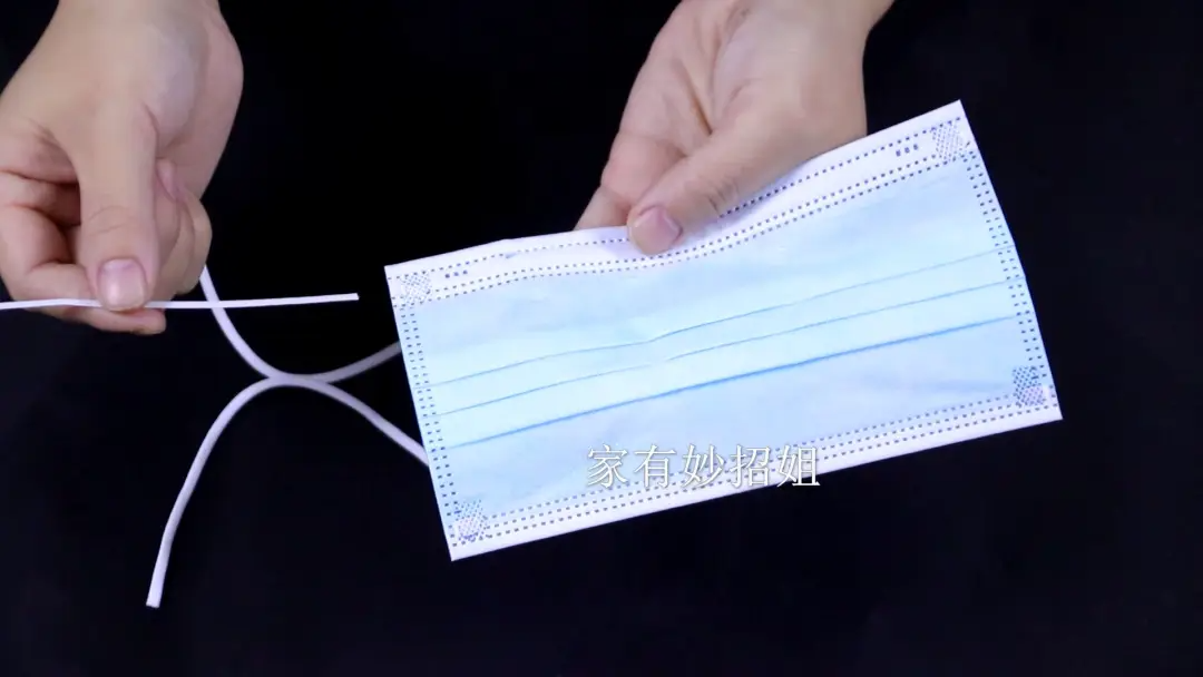接下来再拿上一个一次性口罩,把口罩一边的钢丝条取出来,以免刮伤纱窗。