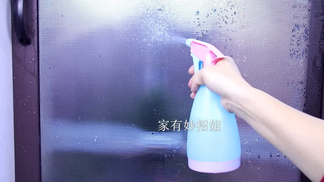 将整个纱窗都用口罩擦拭过后,我们再将喷壶装满水,用喷壶对准纱窗到处喷一喷,利用冲力把藏在纱窗孔洞里的脏污以及清洁液都冲刷掉,这样我们的纱窗也就清洁好了,干干净净的,明显窗外的风景都明亮了很多。