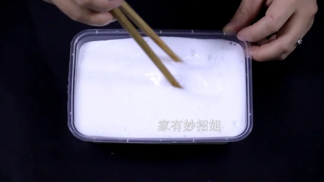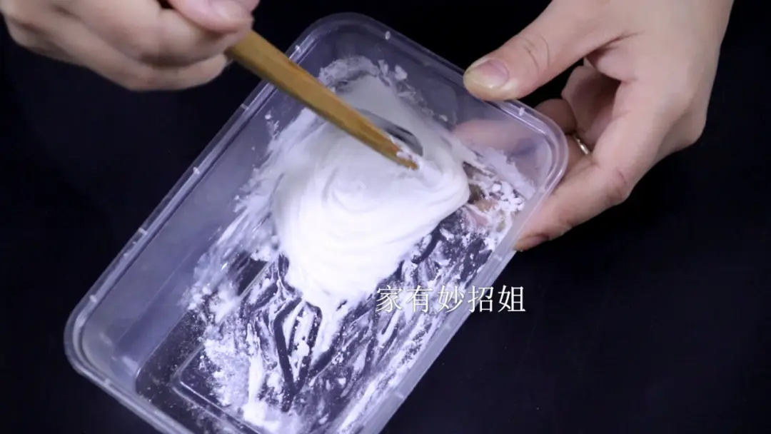 搅拌好,再拿出家里的白醋,倒入一些白醋在里面,由于小苏打是碱性的,而白醋又是酸性的,当白醋倒入里面后,就会发生反应产生大量的气泡。倒入一些白醋后,我们继续搅拌,直到这个混合物变成相对浓稠的液体就可以了,它就可以很好地吸附在纱窗的孔洞里面,帮助把纱窗孔洞中的脏污给清洁掉。