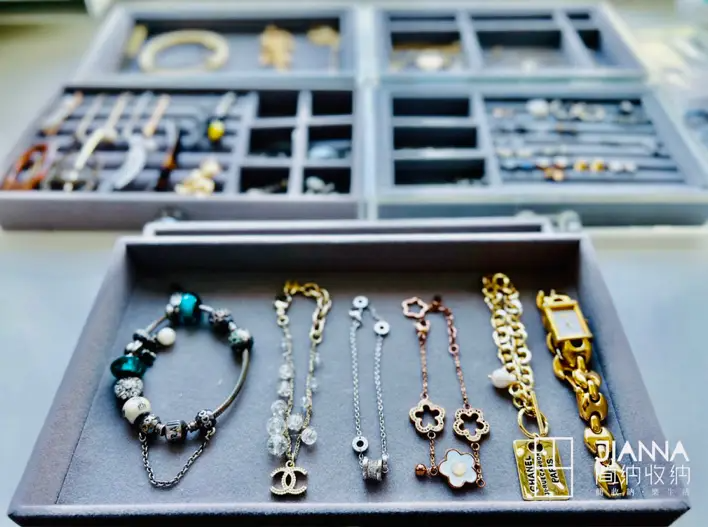 饰品往往收在抽屉里多一些,越是小的零碎的越是要借助收纳盒分类,如:领结、袖扣、首饰、腰带、领带等。