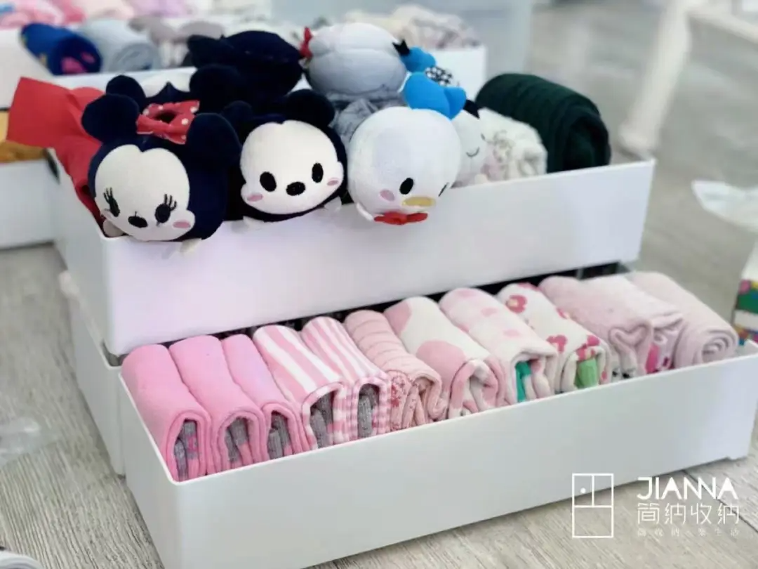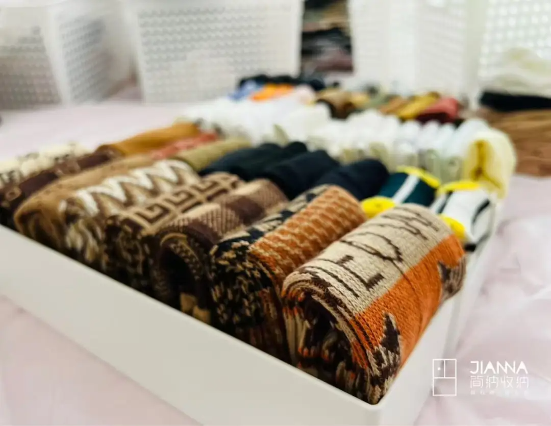 怕变形的毛衣、内衣、袜子、围巾、秋衣等。借助收纳工具,只要是叠放的物品,尽量竖立式收纳,节省空间、好拿好放、一目了然。