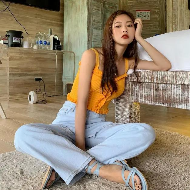 然后款式的话,建议大家选择方领,或者是V领。这两种款式能够恰到好处的露出锁骨部分,整体效果会更显瘦一点。然后在搭配裤子的时候,尽量选择宽松版型的,因为上衣是比较紧身的,而且比较短,所以我们就可以选择牛仔阔腿裤。这种搭配应该是街上比较多的了,而且这种搭配的话,就算腿稍微粗一点,也没有关系。