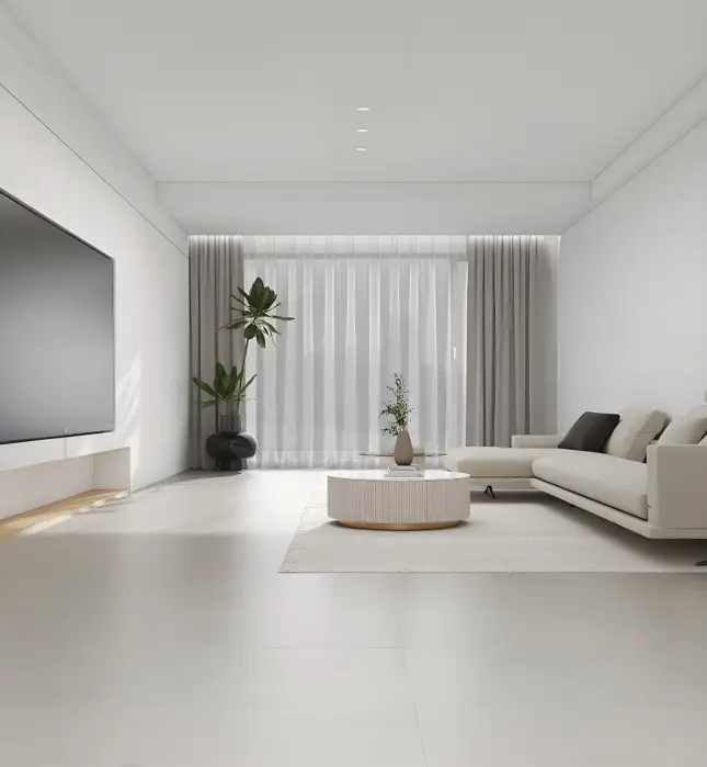 柔光砖,光泽度介于25-55度之间,是近年来市场崛起的新势力。它巧妙地游走在亮光与哑光之间:既规避了亮光砖的刺眼反光,又比哑光砖显得更明亮通透。其纹理多为纯色或淡雅的石纹,呈现一种温和、舒缓的视觉感受,尤其契合当下流行的奶油风、原木风、日式等追求氛围感的现代简约风格,也是无主灯设计的理想地面搭档。