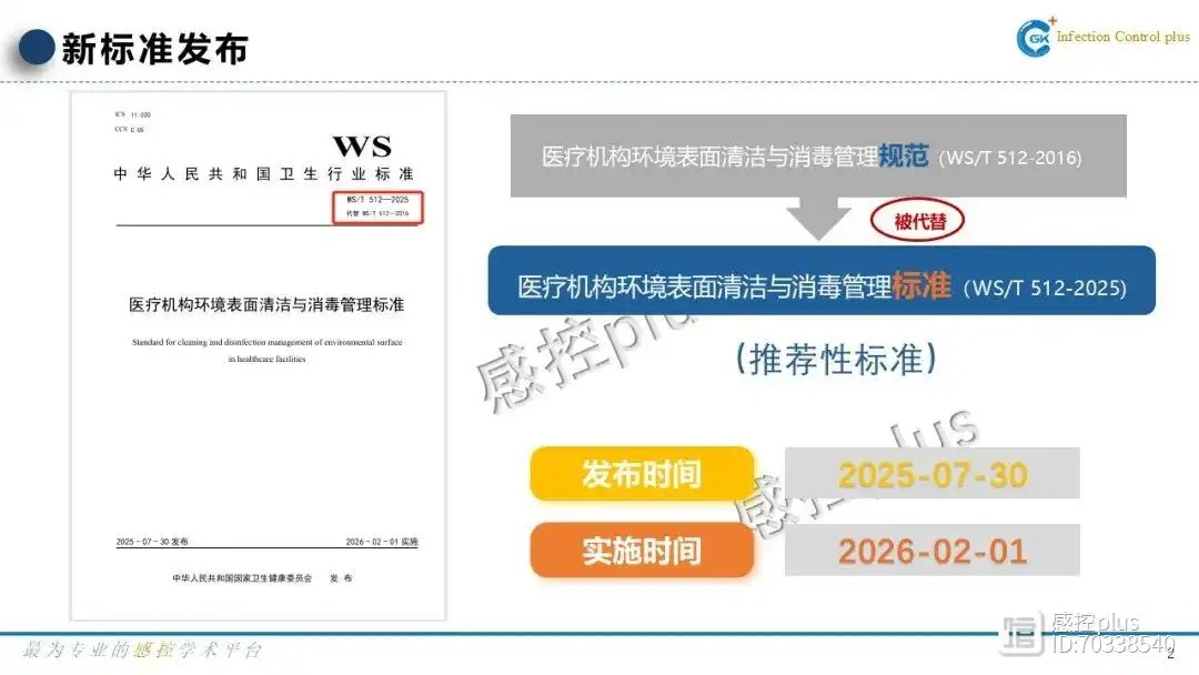 国家卫生健康委员会近日发布《国卫通〔2025〕9号》公告,公布并备案16项推荐性卫生行业标准,其中主要涵盖医院感染控制领域标准14项,其中4项旧版标准将同步废止。新标准将于2026年2月1日起实施,优化当前行业所用规范。感控plus为助力院感新标准学习,特推出系列贯标PPT,同各位院感同仁一起学习。同时,本课件也可用于本院或其他人群的院感知识培训,希望对各位老师有所帮助。
