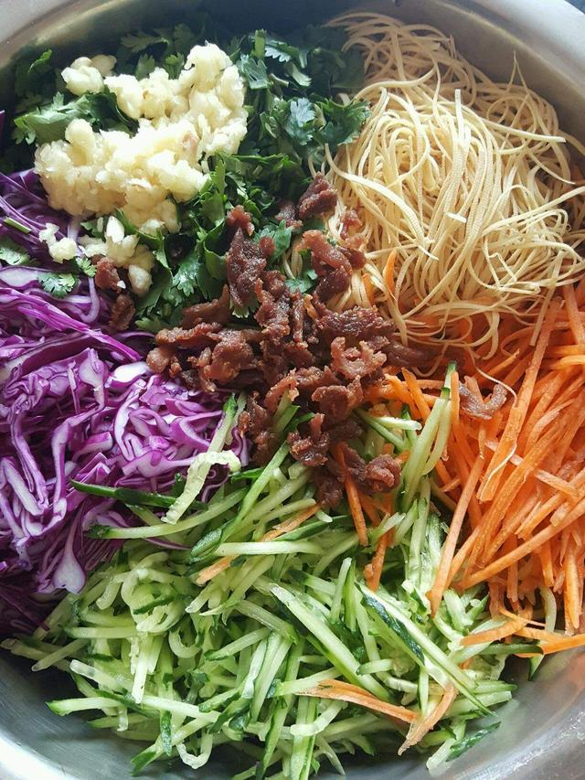 用料:食盐、糖、醋、蒜、香油、椒麻油、花椒粒、味极鲜、胡萝卜丝、粉丝,白菜丝、黄瓜丝、肉丝,姜丝,葱丝、香菜、干豆腐皮