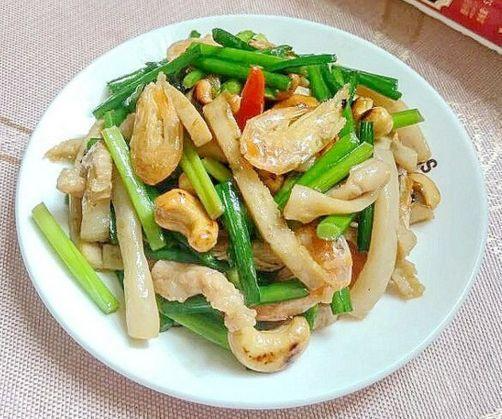 材料:鱿鱼100克、韭菜花150克、腰果50克、姜10克、鱼糕50克、虾干50克、里脊肉50克、油2勺、酱油2勺、盐1勺、蚝油1勺