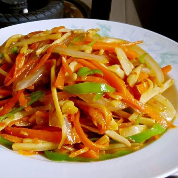 胡萝卜和杏鲍菇可用工具擦成丝,也可以切丝。喜欢香辣味的,可以加几个干辣椒结和蒜白一起爆香,炒出来就比较香辣下饭。