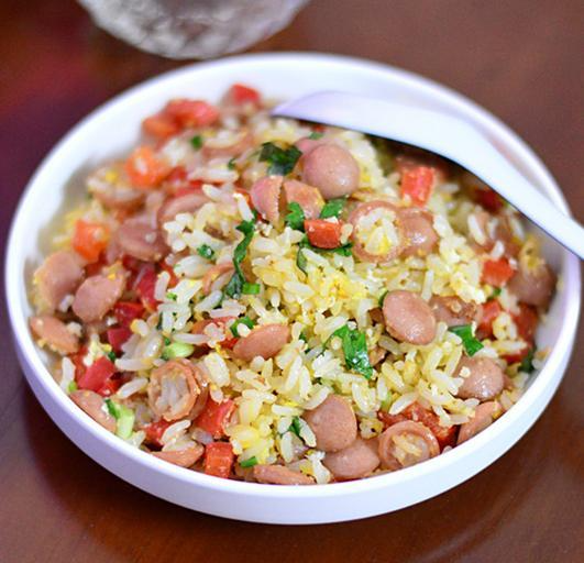 用料:米饭1碗、脆皮肠200克、鸡蛋1个、甜椒1/2个、葱少许、盐1/2茶匙