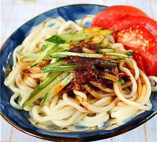 6、冰好的面上浇上蒜泥水,铺上黄瓜丝西红柿即可。