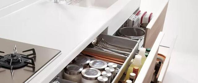 以收纳盒、隔板为主的双层或多层的调料收纳架,可以在台面上容纳更多的调料品且具有一定的观赏性;多使用类似箱盒、可封闭式的收纳容器;托盘收取方便,在不使用时尽量将其收纳进橱柜内。