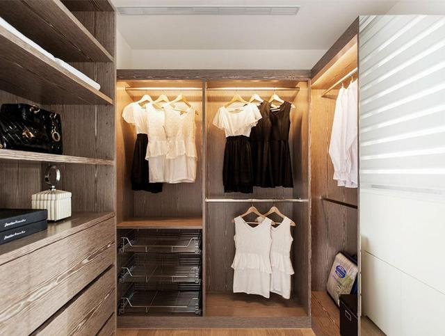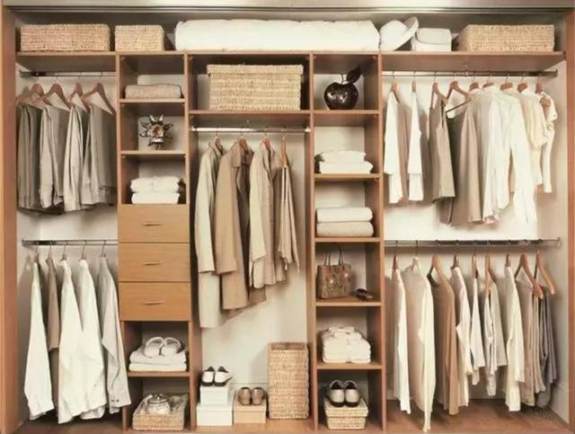 在定制衣柜时,遵循衣柜分区的黄金比例。长衣区高度140~170cm;被褥区高度40~50cm;叠放区高度35~50cm;抽屉宽度40~80cm;上衣区高度100~ 120cm;裤架高度80~100cm。