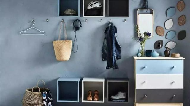 可以使用挂钩、搁板这些小物件,将外套、钥匙、这些零碎的东西从沙发、茶几上解放出来,直接挂在墙上。