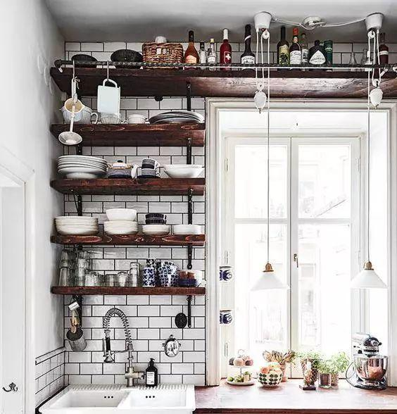 在厨房安装组合物架,上层为收纳、下层为物品放置搁板。