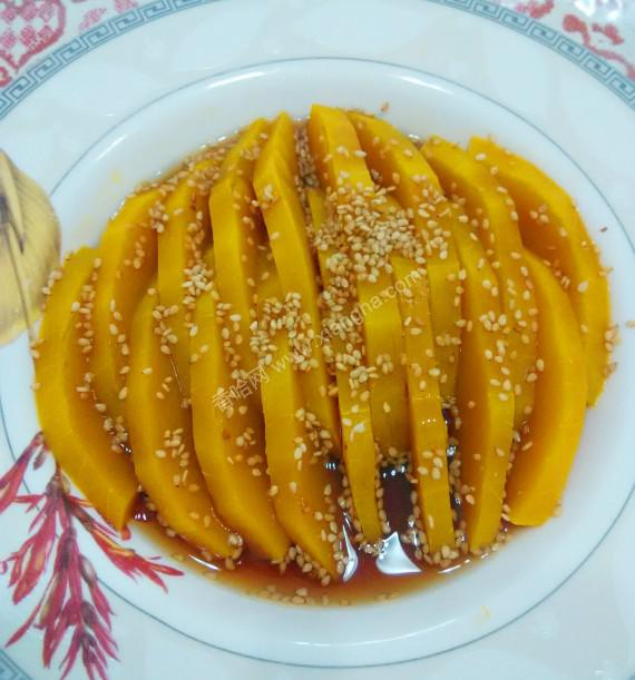 5.蒸熟的南瓜放凉,将蜂蜜汁浇在南瓜上,最后撒上熟芝麻即可。
