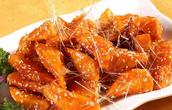 2.锅置旺火上,菜油烧至六成热时,放人红薯块慢慢炸制