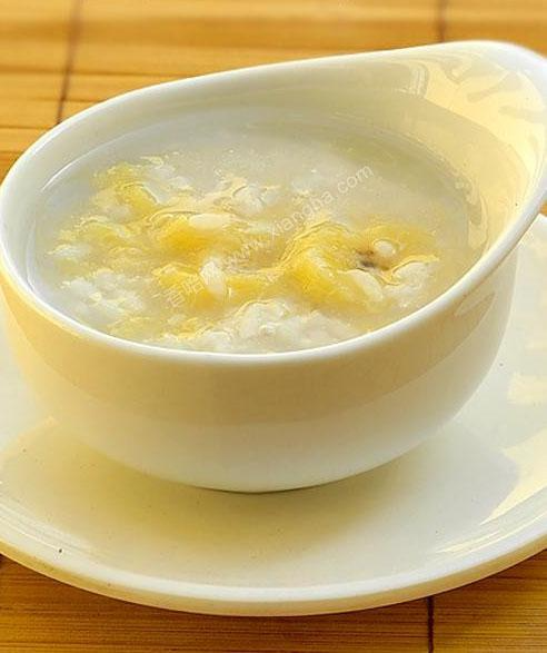7.香蕉倒进去,用勺子不停的搅拌,可以使粥快速变得粘稠。
