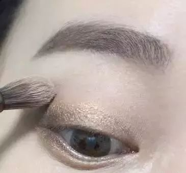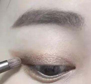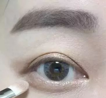 6、蘸取浅杏色的珠光眼影晕染在眉骨下方,增加眼部的立体感。