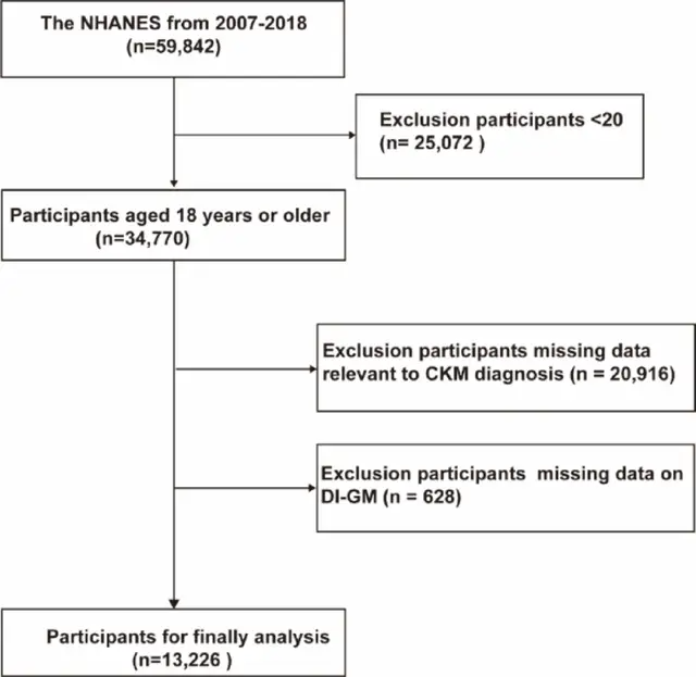 这项研究数据来源于2007-2018年美国国家健康与营养调查(NHANES)。共纳入13,226例20岁及以上成年人。根据AHA标准,参与者被分为早期CKM(0-2阶段)和晚期CKM(3-4阶段)。同时构建了一个名为“肠道菌群膳食指数”(Dietary Index for Gut Microbiota, DI-GM)的评分工具,DI-GM评分基于10种有益食物(如发酵乳制品、大豆、西兰花、膳食纤维等)和4种不利食物(如红肉、加工肉类、精制谷物等)的摄入水平计算,总分14分。