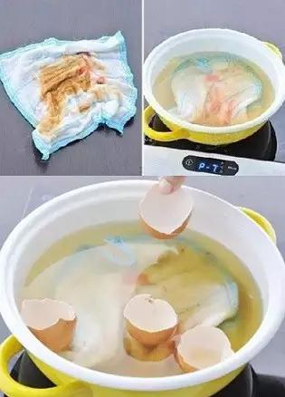 将抹布放到盛满清水的锅中,将大概5个鸡蛋壳放入,大火煮开后,持续煮6分钟,取出洗净晾干即可。此外,放入鸡蛋壳的清水还可以清除水杯内壁的水碱哦,原理是:鸡蛋壳中残留的蛋清中含有蛋白酶,可以分解抹布中的污渍。