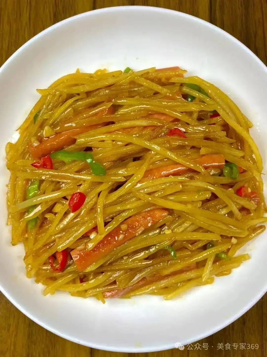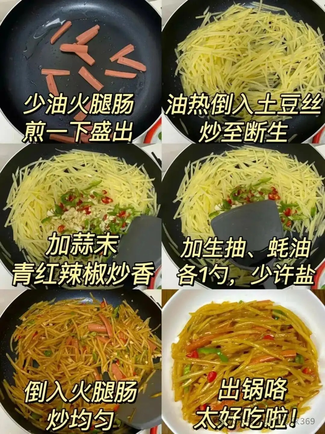 1.土豆切丝后浸泡防止氧化;火腿肠切片,青红椒切丝。