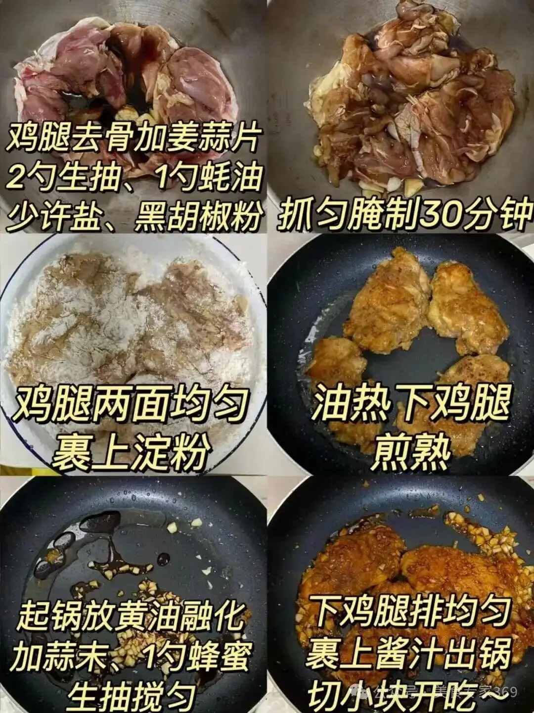 鸡腿、姜蒜片、黄油、生抽、蚝油、蜂蜜、黑胡椒粉、盐、淀粉