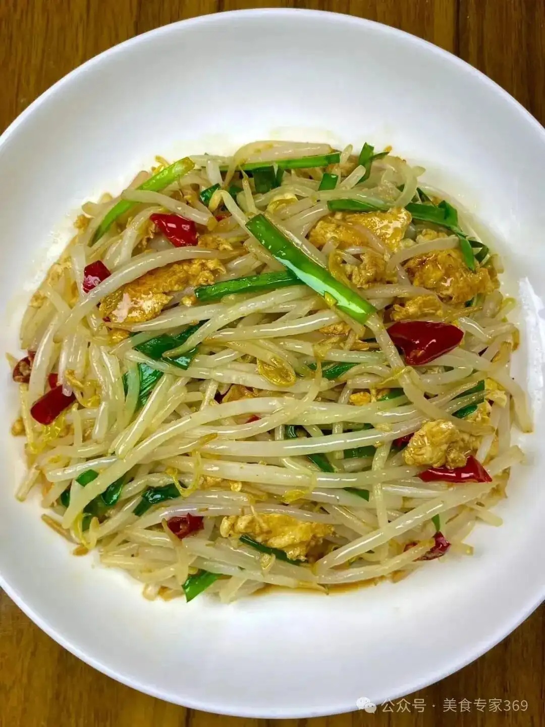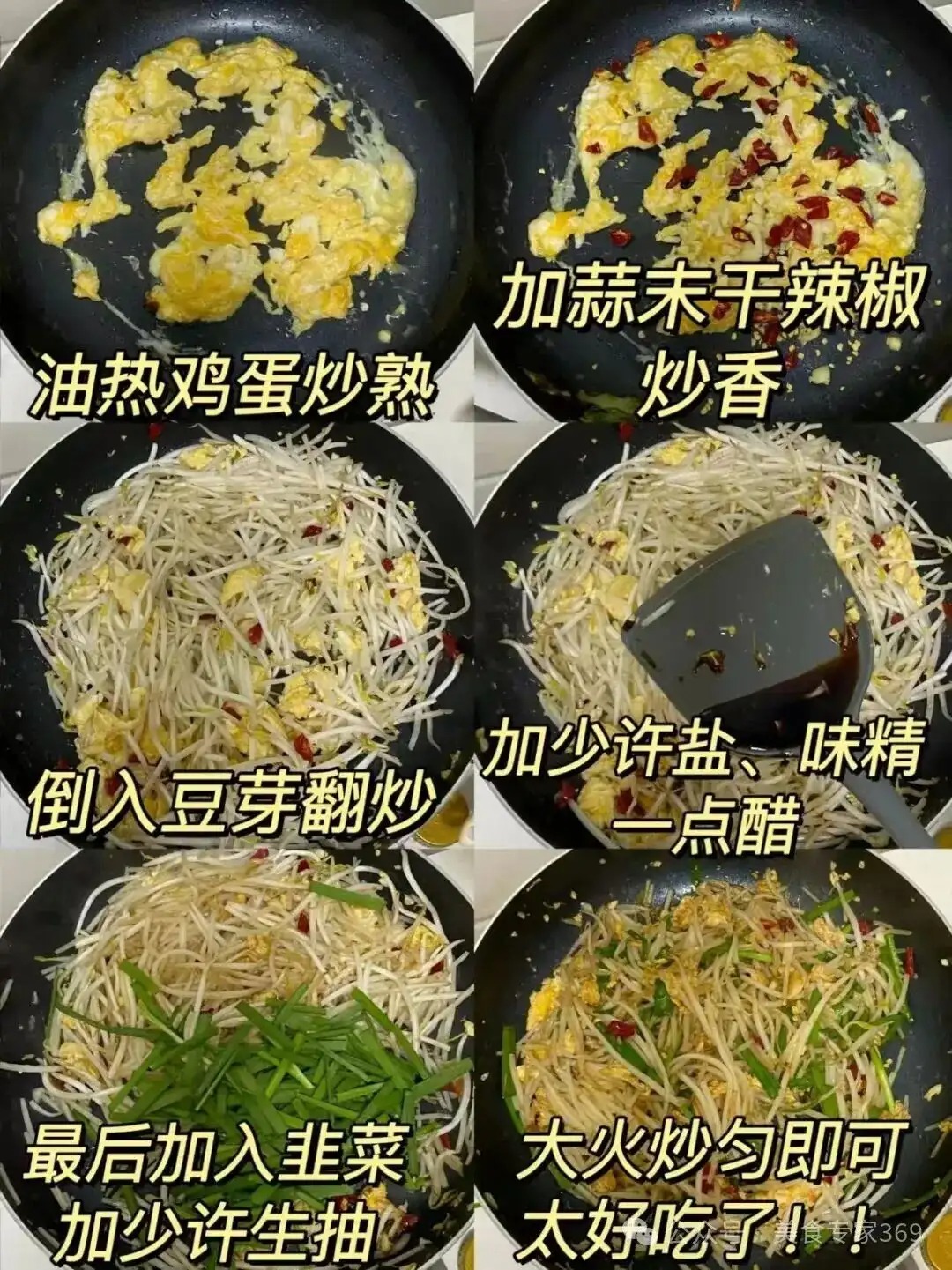 豆芽、鸡蛋、韭菜、蒜末、干辣椒、生抽、醋、盐、味精