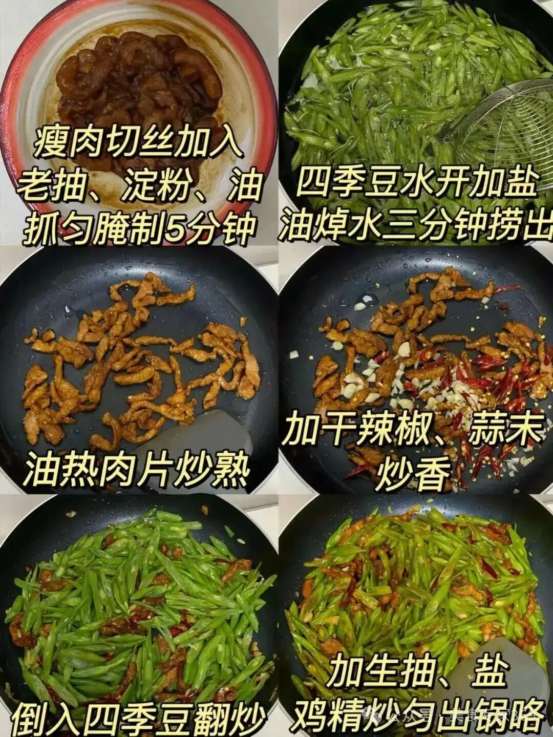 1.瘦肉切丝,加老抽、淀粉和油抓匀;四季豆切段焯水3分钟。