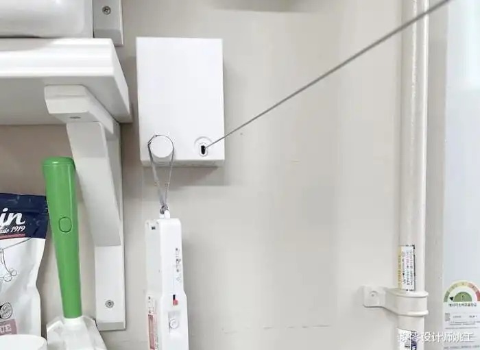 墙上装个伸缩晾晒绳,抹布、拖把替换布就有合适的地方晾晒了;