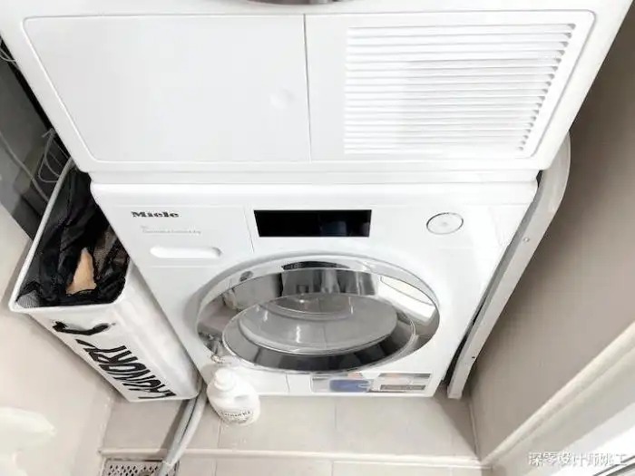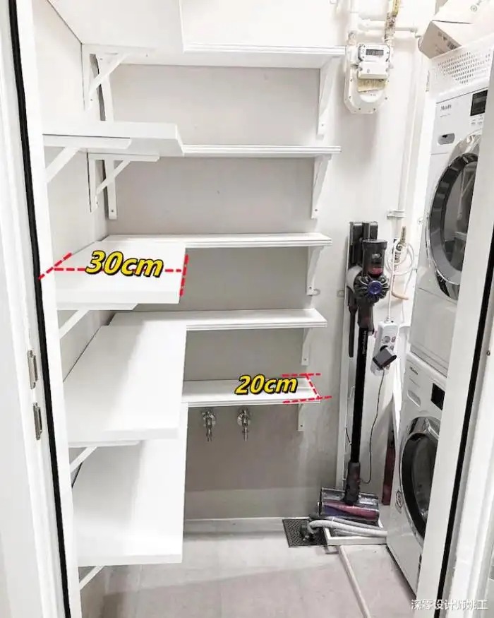 洗衣机烘干机叠放在进门右手边(如图二),腾出的空间直接用货架不是不可以,前提不妨碍洗衣机柜门正常打开。一般货架最小宽度都要35cm,大家根据具体情况灵活调整。