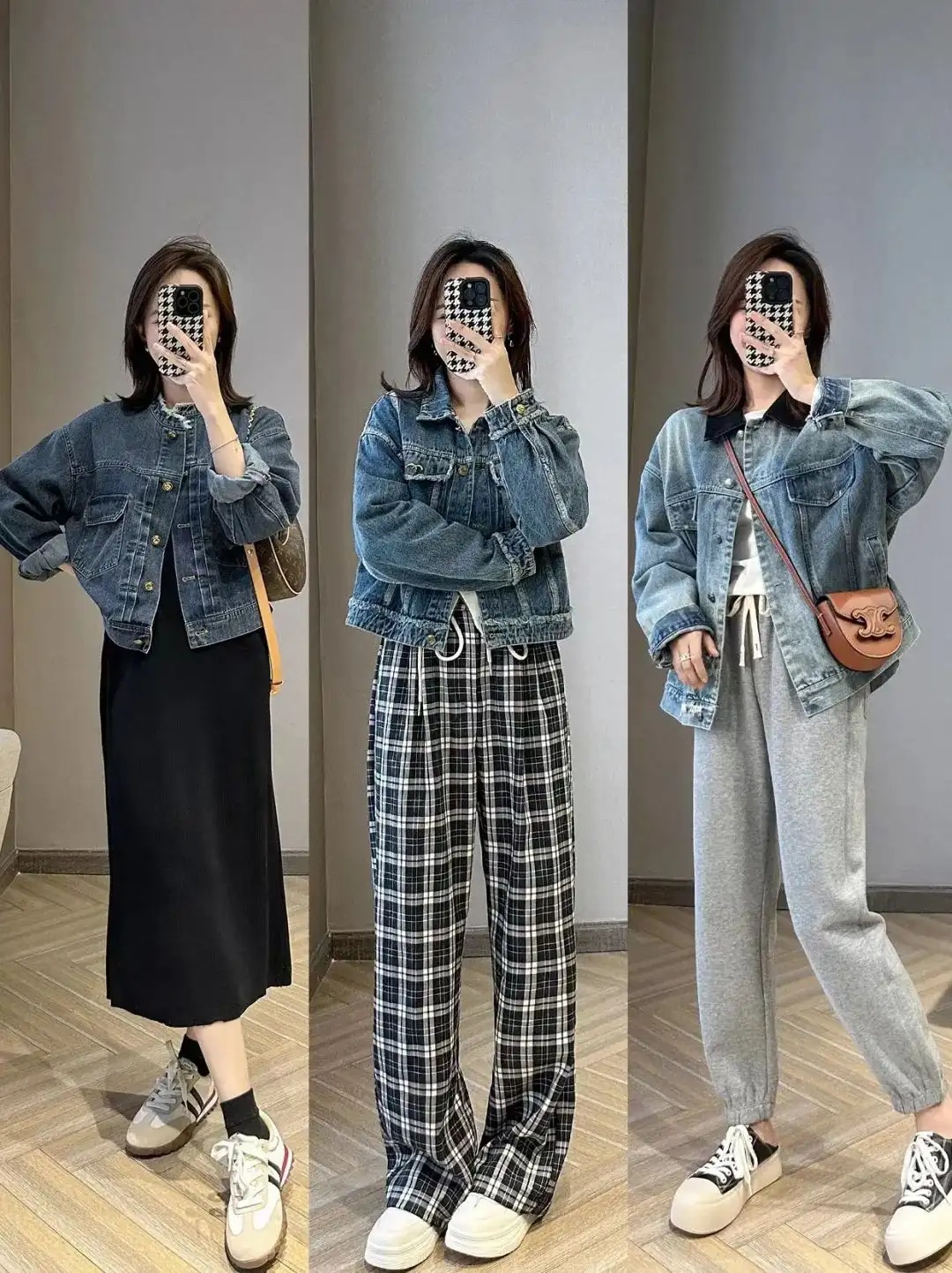 牛仔外套搭长裤长裙也是日常通勤穿搭中的拿得出手的模板,不同身形的姐妹可以选择不同长度的牛仔外套。
