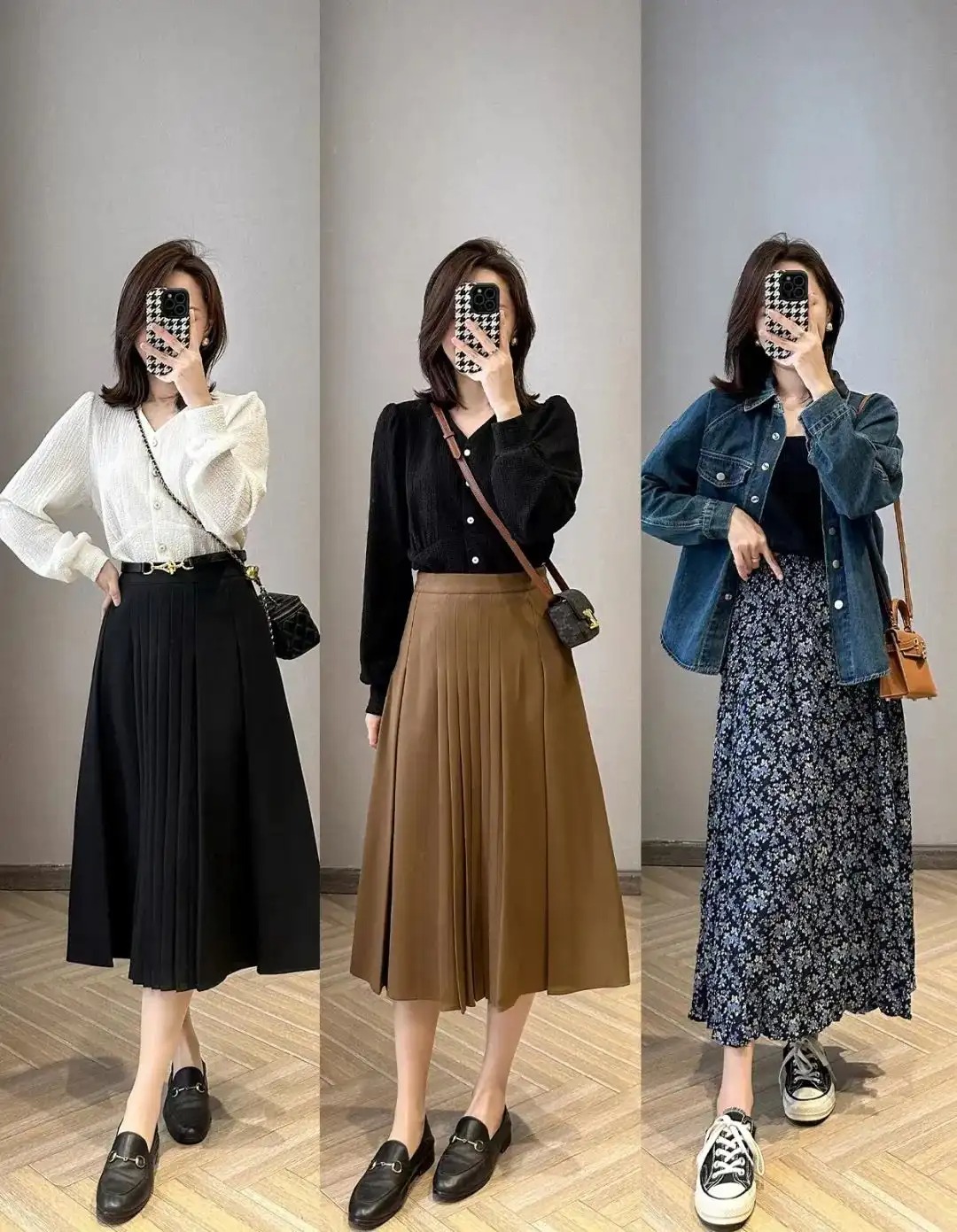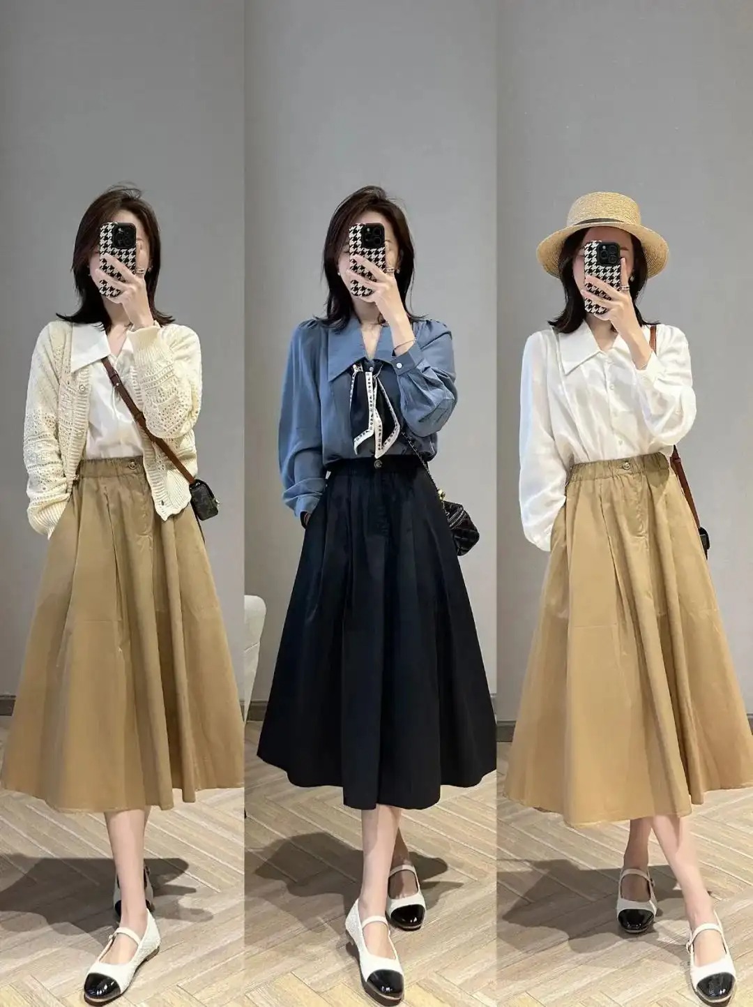 衬衫+半裙是通勤标配,这类组合方式其实可以延伸出很多套不同的模板,你可以用无领衬衫搭配纯色半裙,也可以用平翻领衬衫叠搭高腰百褶裙,甚至可以用紧身小立领衬衫叠搭高腰包臀裙。