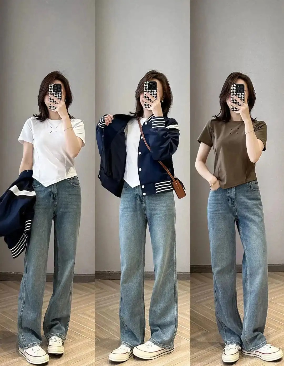 第一类模板是纯色T恤外搭无领棒球服,这类组合方式可以从现在穿到初夏,简约低调不过时,最关键的是正肩类T恤包容性很强,遮肉显瘦还能百搭牛仔下装,不管是上下班路上还是坐在工位上,都贼舒服。