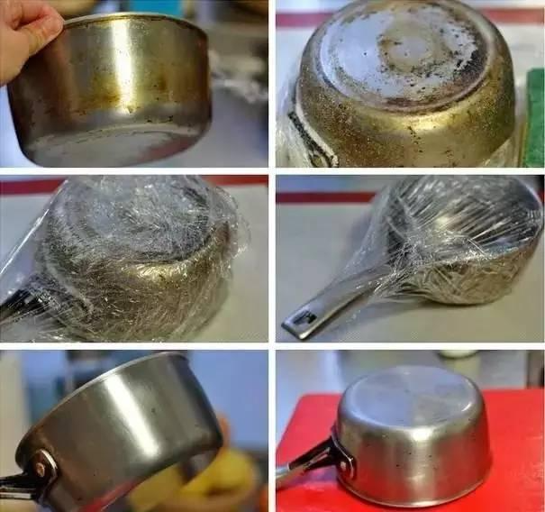 先用水把锅底沾湿,涂上小苏打,再将锅用保鲜膜包严实,放一边去。等第二天,拿百洁布好好擦,锅底就干净了。