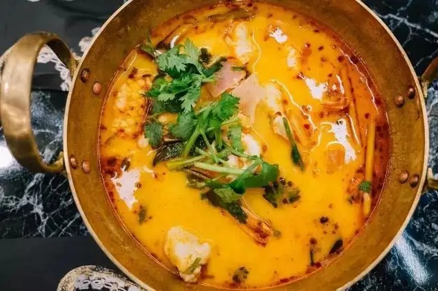 锅内放入柠檬叶,待汤煮开后放入鱼露、糖调味,最后调入椰浆,倒入新鲜柠檬汁即可。