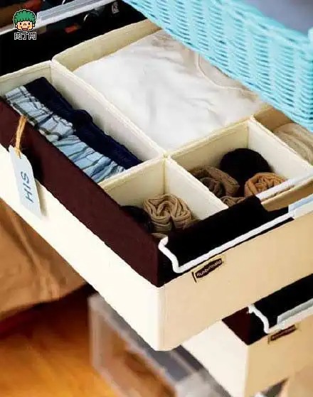 抽屉内的小帆布盒分类存放着袜子、内衣
