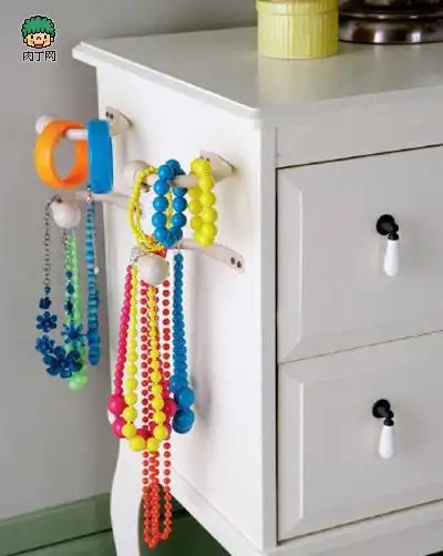 将窗帘的系带挂钩固定到梳妆台侧面或衣帽间的墙上,首饰、领带的收纳难题迎刃而解。手制挂钩可固定在梳妆台或床头柜上,换衣服时可搭配喜欢的首饰。