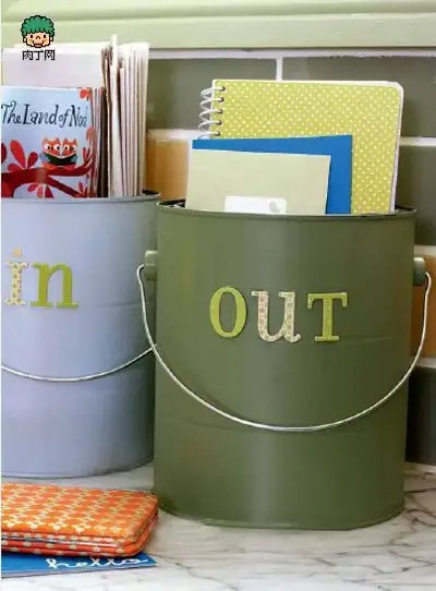 对小桶进行粉刷,然后用剪贴纸制作分类标签,贴在小桶上。如果担心物品混乱,可贴上小标签。