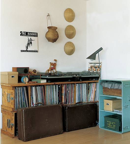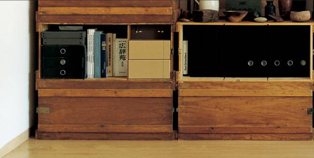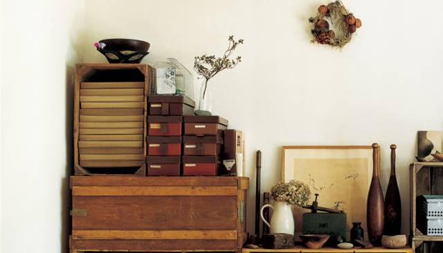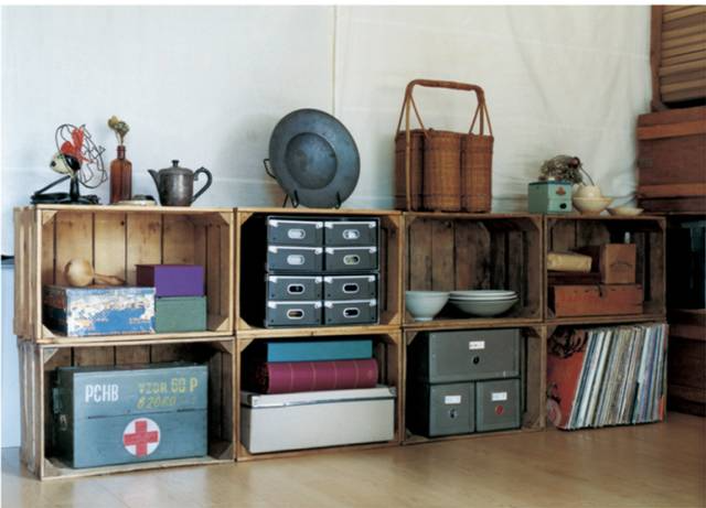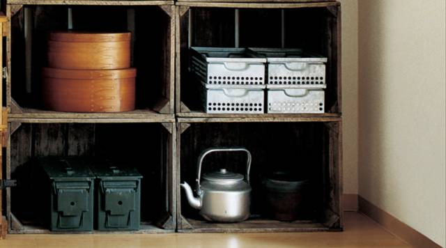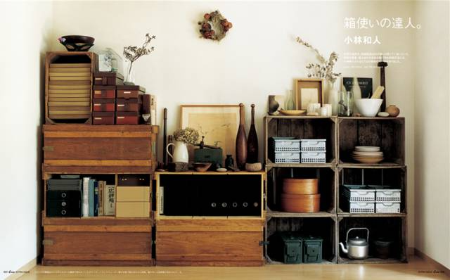 最初小林和人家里用的都是无印良品的铝制收纳箱,但随着时间的推移,他渐渐被两款收纳箱的魅力吸引住了,现在他家里的收纳架全是它们的组合——木制土豆箱(下右)和瑞典的军用木箱(下左)。